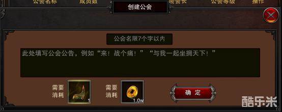 创建公会需要拥有金钱外,还需要上古神物:蚩尤之角后才能进行创建公会,创建公会时,公会名称最多可使用七个字,公会宣言由玩家自己设定。