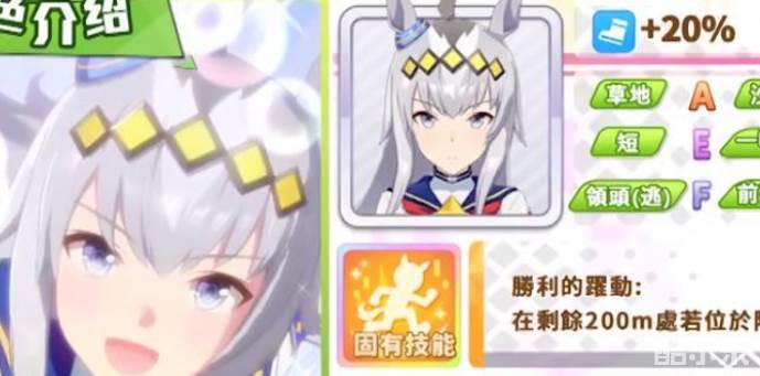 固有技能:胜利的跃动。在剩余200米时,如果处于队伍的前列会开关道路并十分容易突围。速度加成数值0.45,持续时间5秒。