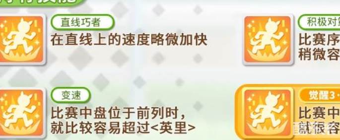 最后一个技能则是如果大树快车在比赛序盘的时候位于前列的话,那么她会更加容易扩大差距,这个技能也是只有在英里赛才能触发。这是大树快车的基础技能,在看过之后,得出的结论是,虽然这些技能发动率很高,而且技能效果都非常不错,但是技能只能在英里赛触发,其他赛事这些技能是没有任何作用的。所以玩家们尽量让大树快车参加英里赛。