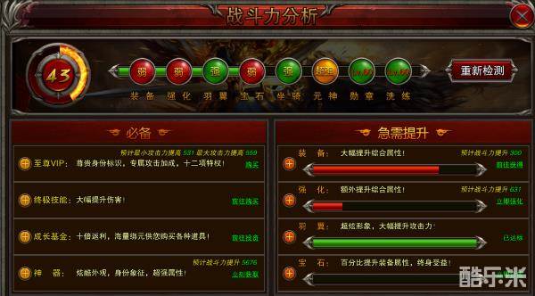 点开后会弹出战斗力分析的界面,是强是弱一目了然。小编我仔细一看,幸好战斗力还有43,不至于是战5渣,但在好几个方面都急需提升。我们逐个点进去看看。