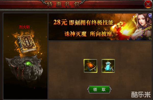 接着就是终极技能。传说中PK时能把对方一刀秒杀的烈火斩只需28元,这价格让小编心里痒痒的,虽然性价比没有至尊VIP的高,但烈火斩这种居家旅行杀人抢Boss必备的技能实在太吸引,咬咬牙一块买了!