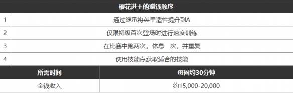 樱花进王的赚钱方法是让樱花进王比赛,尽量每次都拿到第1赚取大量金钱的方法,虽然费时间但是要比日常比赛的一场困难难度赚的还多,所以非常推荐,也可得到因子,因此比起乌拉拉,还是更建议樱花进王。