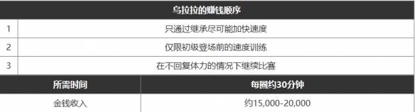 乌拉拉赚钱法指的是让乌拉拉一直参加比赛,虽然废时间,但是可以赚取超过一场困难难度日常比赛的钱。