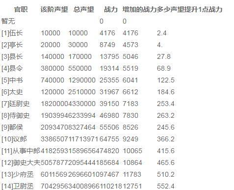 经过一系列计算,声望在通过官职提升战力的过程中,是逐渐贬值的。换算起来,在第14阶卫尉丞时,需要552点声望,才能提升1点战力。