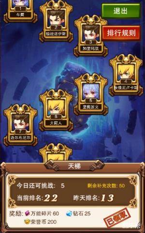 天梯挑战系统每天只有五次机会,仔细筛选想挑战的对手,看看自己有没有实力干死他。如果实在看某人不爽,不妨花费少量钻石购买挑战次数,狠狠干他。天梯是有名次高低之分的,越往上奖励越丰厚。如果你能达到前三甲,还有耀眼的称号送你,这可是装B利器。所以加强自己的实力,奋勇争先,突破天际。