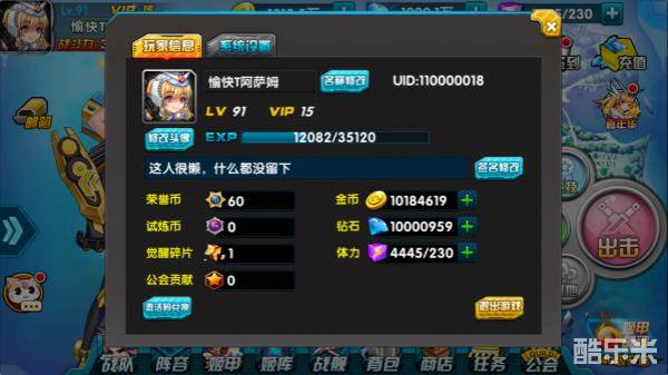 玩家信息界面有关于玩家的详细信息,头像的更换,名称修改,ID号,等级,VIP等级,经验签名等等。