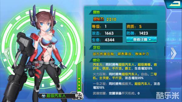 S资质的超强汽车人拥有超级领导模块的领袖级姬娘,对姬娘都有控场的功效,一般来说,战队带着女神,绝逼杠杠的。尤其是在对敌人的武装武力压制上,不但降低了对手的攻击,而且强悍的群体攻击可以瞬息让地方姬娘瓦解。