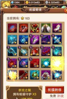 那我们就拿这调皮的家伙没有办法了吗?那肯定不会的,祝福转移就是教训它的好办法。每天祝福转移会自动刷新三次,当然还有其他途径可以获得次数。多多的转移祝福星,直到它附加到你心仪的圣物上。圣剑作为终极圣物,我的建议是大家尽量让这调皮鬼祝福星附加到这上面。