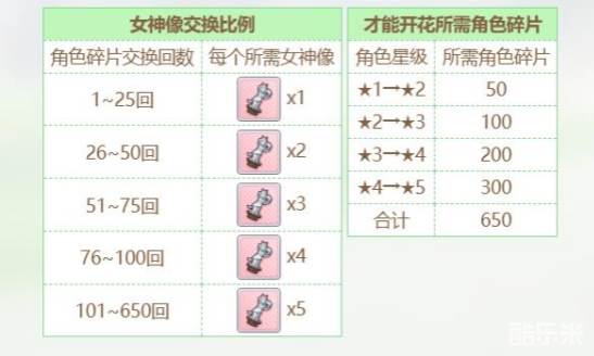 1、角色碎片交换25回以下,获得1个女神像,26至50回可获得2个。