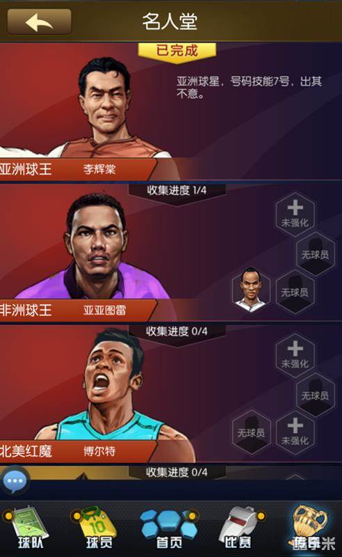 另外还要注意下强化全员球员,到+4可以得到有出其不意这个远射技能的传奇球员李辉棠,强化材料不够的话建议刷关卡装备,使用快攻快速完成。