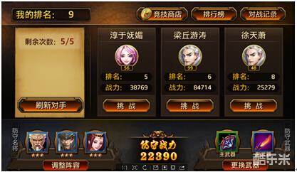 竞技场胜败的主要因素:副将。战斗中如果你拥有3个战力突出的武将,那么胜利就是非常轻松的事啦。武将每次召唤都会释放主动技能,因此,在战斗过程中就只需要连续召唤武将,特别是爆发技能突出的武将(例如:五虎上将)就可以瞬间打出爆炸伤害,胜利不过是囊中之物