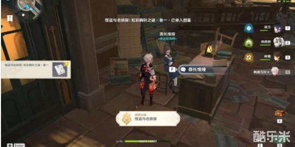 玩家传送枫丹廷区灰河地下锚点,往地图的西北方向飞;前往图中指引书架,收集怪盗与名侦探:虹彩胸针之谜·卷一;交互获得成就「怪盗与名侦探」。