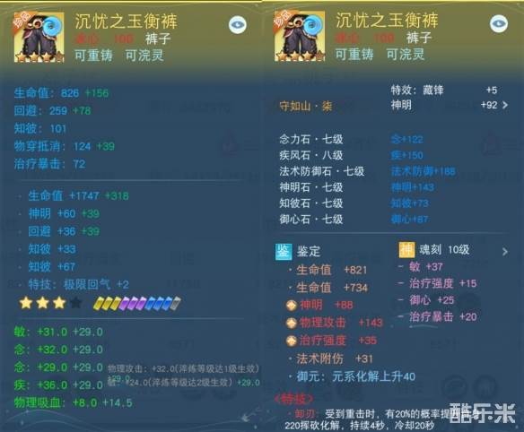 这件【沉忧之玉衡裤】以4602点生命值能够帮助我在战场中站稳脚跟,734.5点回避更灵巧地躲闪强力袭击,529.5点神明和274点知彼更可抵挡部分伤害,是一件不俗的防具。