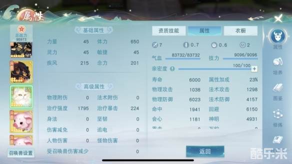 召唤兽的话我是先把资质全部喂满,星级升到7星。一般情况下我比较喜欢带白泽,因为会增加生命和治疗,但是如果要做输出的话,我比较喜欢带豚豚,因为攻击会高,给大家分享一下我的召唤兽面板吧~