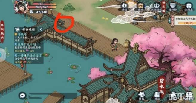 在碧水阁附近的廊桥上,后面是铁匠铺。