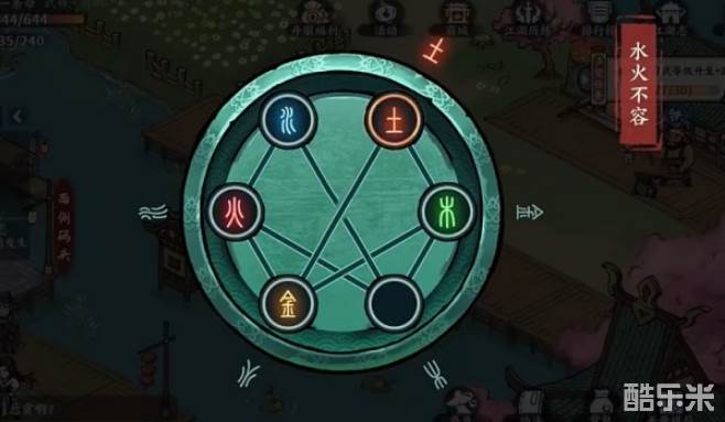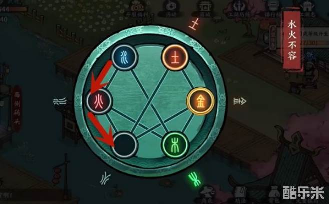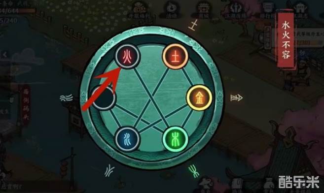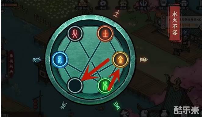 5、将木移回原来的位置,将金移动到最右边位置,火摆放到左下方,水放到最左边即可。