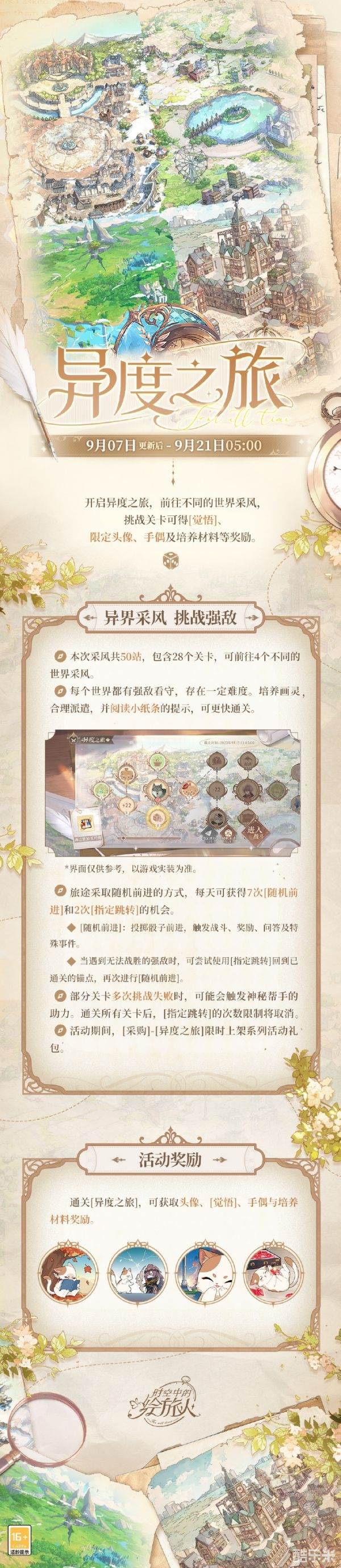 9月7日更新后 - 9月21日05:00,全新采风「异度之旅」开启,参与活动可得限定头像、[觉悟]等珍贵奖励,首次通过第35站可获手偶[自己·原初血脉]。