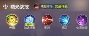 在战斗中大家选择好角色之后,角色的技能是固定的,都是3到4个技能,不过还有一个战技需要大家进行选择,而战技主要有神恩,加速怀表,审判,跃迁,心灵加锁和天罚,其中最适合打野佩戴的就是天罚了。