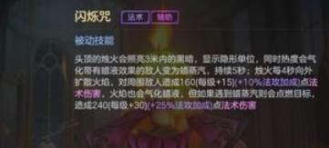 二技能是让自己化身成蜡液,然后自己的移速提高30%,并且在该状态下敌人是无法选中,这样就可以快速躲掉敌人的伤害啦,大招是快速向敌人方向发射出强势烈焰,对其造成280点伤害,并且该效果还可以释放两次,自己还可以获得加速效果哦。
