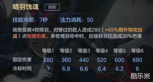 一技能投掷出四枚暗器,穿过敌人造成伤害,如果多枚命中同一目标,则后续伤害大幅衰减,简单易懂的消耗类技能,从前到后都很实用。二技能使得瑞恩从敌人影子中出现,在另一侧发动攻击并将目标标记出来,对标记目标造成普攻将会减少此技能的冷却时间。被标记英雄死亡时,还将对附近敌人造成恐惧效果。另外在开启该技能以后,将立即获得被动所拥有的强化状态。