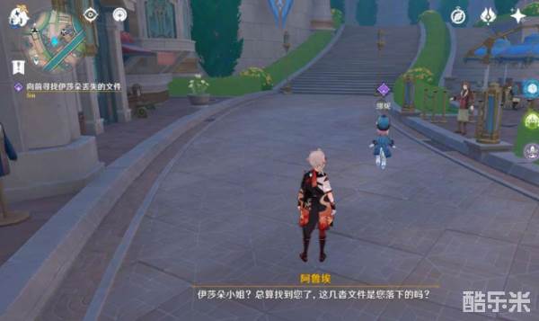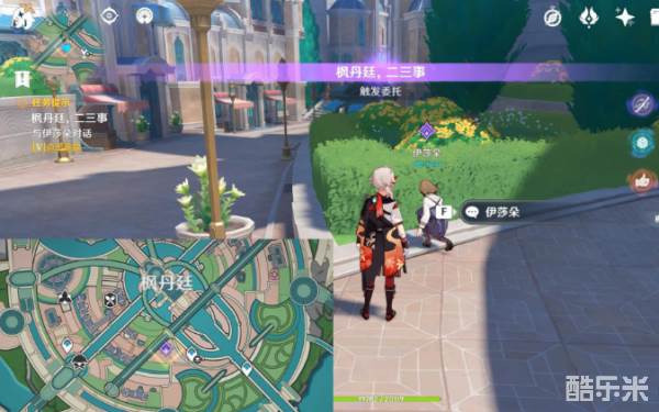 1、首先先来到枫丹廷的东南方向,到达之后去往广场边的草丛边与伊莎朵对话;