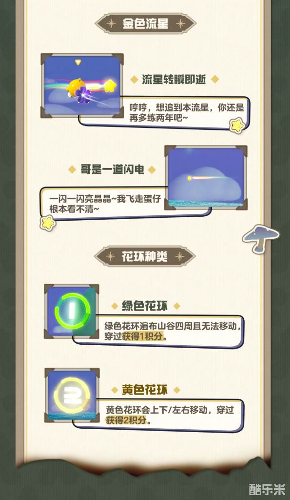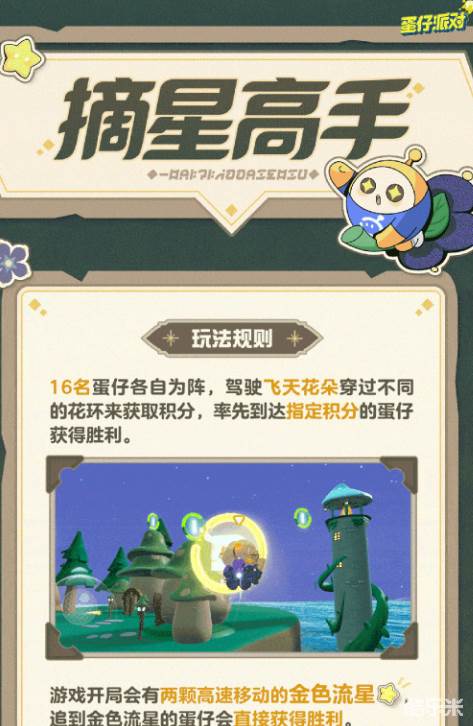 16名蛋仔们将各自为阵,在广阔的蘑菇山谷中骑乘飞天花朵,穿环获得积分。同时场景中还会有飞速移动的星星,捕捉到就可以获得大量积分直接胜利 (胜利后其他玩家也可以在场中短暂停留) 快来试试成为摘星高手吧!