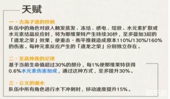 角色天赋可以在当前生命值超过30%时,超过的部分每1%可以使角色获得0.6%水元素伤害,最多增加30%。