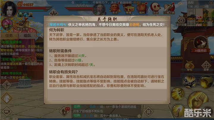 新版本中,在洛阳会新增转职NPC,转职的具体位置参照上图,和结拜水平的地方,方便玩家找寻。玩家点击“转职”,打开转职界面。温馨提示:如果大侠不太明白转职的情况可以点击“查看转职说明”,