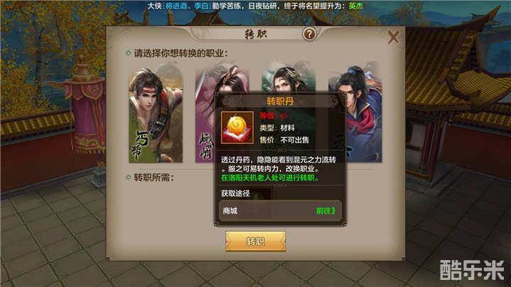 首先大侠要在绑元商店购买转职丹,然后大侠可去洛阳找到转职人,大侠点击“转职”,会提问是否开服30天,其次要达到65级以上(≥65级),然后大侠就可以开始选择自己想要的职业啦是,可千万别犯糊涂选择原有职业,相同职业无法进行转职哦!千万记住,玩家一定不要再组队、运镖双人动作、死亡状态,、读条状态或者变身状态进行转职否则将无法转职哦!点击确认继续完成转职操作,恭喜大侠,你将会进入新的门派,而系统将为您卸下门派套装、属性攻宝石和减抗宝石,并放入背包(注意背包中一定要留足空间来堆放宝石)