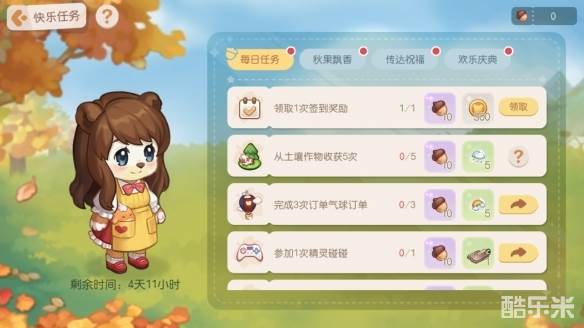 一分耕耘一分收获,在丰收庆典上积极收集橡果精灵最爱的「丰收橡果」,就可以在快乐商店兑换装扮「红蘑菇连体衣」「金秋板栗头套」「秋天的第一封信」「乱糟糟落叶」等、家具「农耕丰收小旗」「农耕蘑菇小果篮」等,诸多限定好礼,小奥比们可别错过啦!