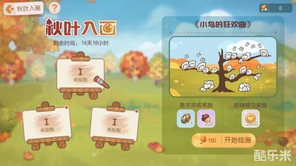 为了感谢小奥比的帮助,丰收精灵们用各种颜色的秋叶做成了美丽的叶子画,可这份谢礼在运送的途中意外失去了颜色,快去收集秋天的色彩填满叶子画吧!完成叶子画即可获得家具「小鸟的狂欢曲」「狐狸和小兔」「鼠鼠嘿嘿笑」