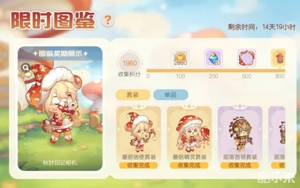 限时图鉴活动开启!活动时间内完成收集限时图鉴内收录的装扮部件,即可获得对应收集积分,前来收集解锁对应的进度奖励吧。奖励包括丰厚的晶钻和装扮物品,达成对应进度可解锁幻光「蘑菇足迹」、装扮散件「秋叶印记相机」、晨星品质称号「伞伞惹人爱」等奖励,达成最终积分进度还可领取背景卡「秋日蘑菇小屋」。