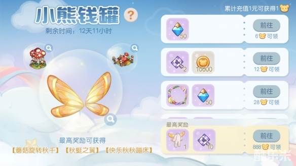 小熊钱罐限时回馈活动上新,在活动期间,每往游戏内储蓄1元,即可获得1点小熊积分。当小熊积分达到对应的奖励积分档位时,可解锁对应的进度奖励,丰厚的奖励包括「蘑菇旋转秋千」「快乐秋秋蹦床」互动家具、「秋蜓之翼」、「友谊音符」头像框、「落叶知秋街道」背景等,快快来参与吧!