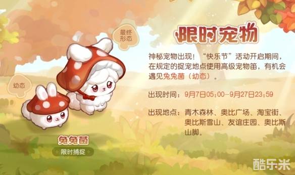 神秘宠物出现,是兔兔还是蘑菇?活动期间限定宠物「兔兔菌」将会出现在奥比岛。前往岛内捉宠地点,使用高级宠物笛就有机会和它相遇哦。