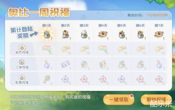 活动期间内,奥比们通过每日登录即可领取7日祝福奖励。购买进阶祝福(本次含:染色祝福/订单祝福/彩蛋祝福),还可获得对应祝福的更多奖励哟!