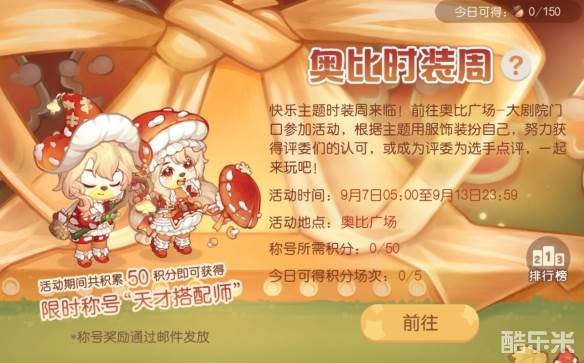 第十四期奥比时装周——快乐版本特别来袭!舞台背景更换为全新秋季风格。活动期间总共累计50积分,即获得限时称号「天才搭配师」。每轮比赛你将会随机分配得“评委”或“选手”角色牌。搭配主题装扮,努力获得评委们的认可,或成为评委为心仪的选手进行时尚点评吧。通过结算分享功能,小奥比们还可以将当场的参赛搭配分享出去哦,参与时装周比赛,争当最潮流的奥比!