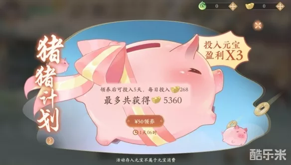 2、活动分领养,储蓄,收获三个阶段,领养阶段持续2天,在规定时间内领养猪猪方可进行后续阶段,储蓄阶段持续5天,领养猪猪后即刻开启,每天可储蓄一定数量元宝。收获阶段在储蓄阶段结束的次日,可收获基于总储蓄额度一定倍数的元宝返利;