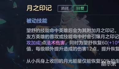 首先来简单了解一下4个技能主要效果,被动在命中敌方英雄后附加印记,印记持续6秒钟,无论是望舒或是其他友方英雄普攻或是技能,命中后都会将印记引爆,造成额外伤害,望舒自身恢复血量。一技能从灯中释放出蝴蝶,蝴蝶触碰到对方英雄、野怪或是己方英雄都能够将能量扩散出去,造成范围伤害并降低移动速度。范围之内的友方单位,则是增加护盾并且提高移动速度,这样既有输出又有护盾,所以也具有了一定辅助能力。
