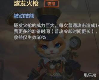 被动效果为提高普通攻击所造成的伤害,但是普攻冷却时间更长,即使是从装备中获得了额外攻速,也只能有50%的效果发挥出来。这是该角色在出装使用方面和其他角色最大的不同,如果利用得当,那么将是很好的优势,但需要花一些时间来适应它的攻击节奏。一技能需要短暂瞄准后利用火枪发射出强力子弹,对直线上的敌方单位造成物理伤害,并将三米内的敌方单位击退。