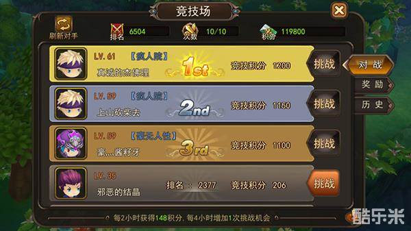 战斗规则:玩家从竞技场界面向其它玩家发起挑战,胜利排名提升,失败排名不变。无论胜负都扣取竞技场挑战次数。挑战次数每4小时增加1次。