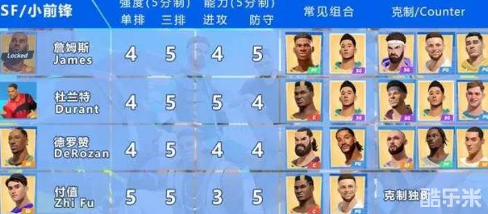 傅值,外线防守大闸之次闸,防守神技极限补防,撞停容易被抢断,防的外线呱呱叫,尤其是那些爱运球的,某布,某库,那叫一个难受,大招抢断多一次球权,真香。缺点,进攻端植物人,易防。
