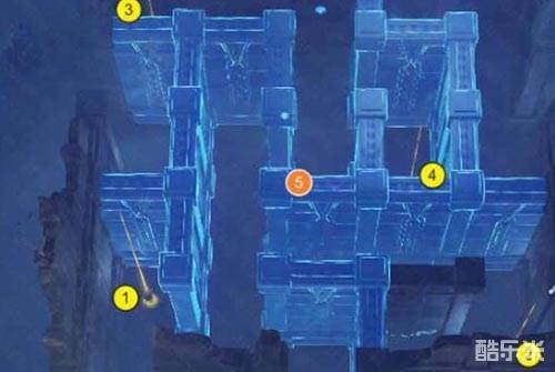 3、一般常夜情况下,从左下角的迷宫开始,然后沿着下图1-4位置的水元素方尖碑,解锁5位置的天窗,解锁迷宫;