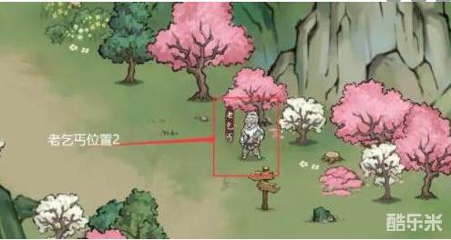2、老乞丐位置二会在桃林里面找到,下面还有个路牌。