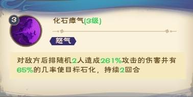 对敌方后排随机2名敌人造成261%的伤害并有65%的几率使目标石化,持续2回合。