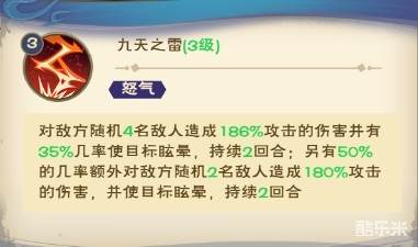 对敌方随机3名敌人造成186%的伤害并有35%的几率使目标眩晕,持续2回合;另有20%的几率额外对敌方随机2名敌人造成180%的伤害,并使目标眩晕,持续2回合。