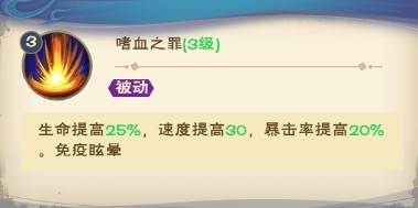 生命提高35%,速度提高30,暴击提高20%,免疫眩晕。