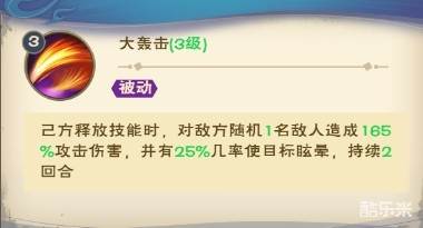 己方释放技能时,对敌方随机1名敌人造成165%攻击伤害,并有25%几率使目标眩晕,持续2回合。