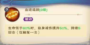 生命低于60%时,自身减伤提升50%,持续5回合(仅触发一次)。