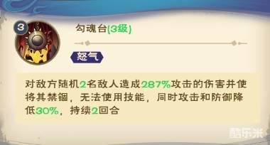 对敌方随机2名敌人造成287%的伤害并使将其禁锢在勾魂台上,无法使用技能,同时攻击和防御降低30%,持续2回合。