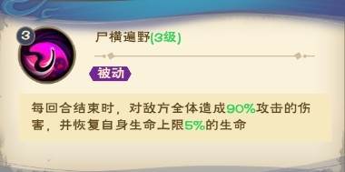 每回合结束时,对敌方全体造成90%攻击的伤害,并恢复自身生命上限7%的生命。